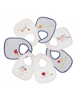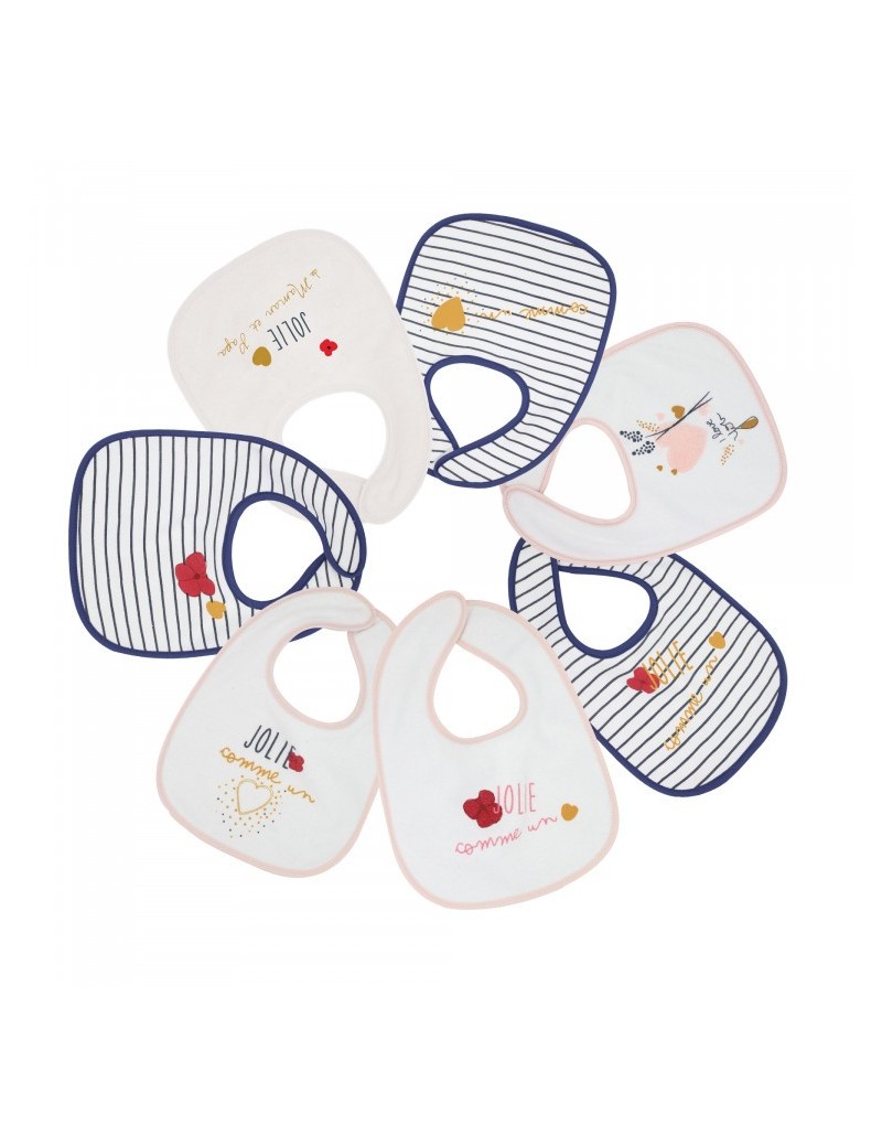 Parce que toutes les petites filles sont jolies comme des cœurs, ce lot de 7 bavoirs 1er âge leur conviendra à coup sûr ! On craque pour leurs coloris rose poudré et bleu marin ainsi que leurs décorations. Ils sont conçus en éponge doublée éponge avec un intérieur en TPU. Ils sont au format 22x30 cm.
