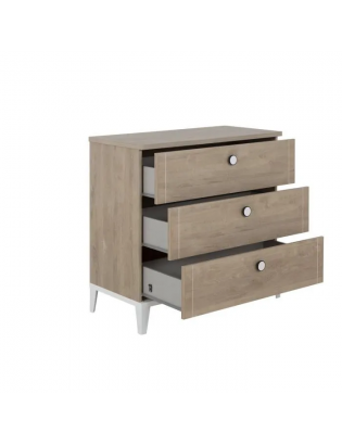 Cette commode enfant dispose de trois tiroirs d’une profondeur de 46 cm offrant un vaste espace de rangement pour les affaires de bébé. Ils sont habillés avec du polypropylène imitant le textile et sont fixés sur des coulisses à galets grises. Pour éviter de troubler le sommeil de bébé, les tiroirs disposent de freins amortisseurs pour une fermeture tout en douceur.