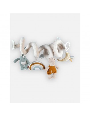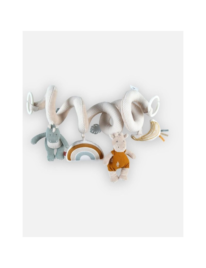 La spirale d'activités ludique Tiga, Stegi & Ops se fixe facilement au parc, siège auto groupe 0 ou encore poussette grâce à sa forme particulière et ses attaches en forme de C.