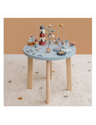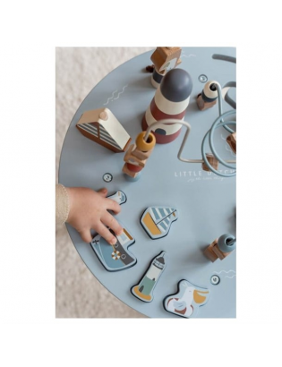 Votre enfant prendra plaisir à découvrir toutes les activités sur cette table d'éveil. Il pourra aider les mouettes à passer les perles de part et d'autre de la spirale, construire le phare, encastrer les formes, faire tourner les engrenages et naviguer sur l'océan avec les petits bateaux.