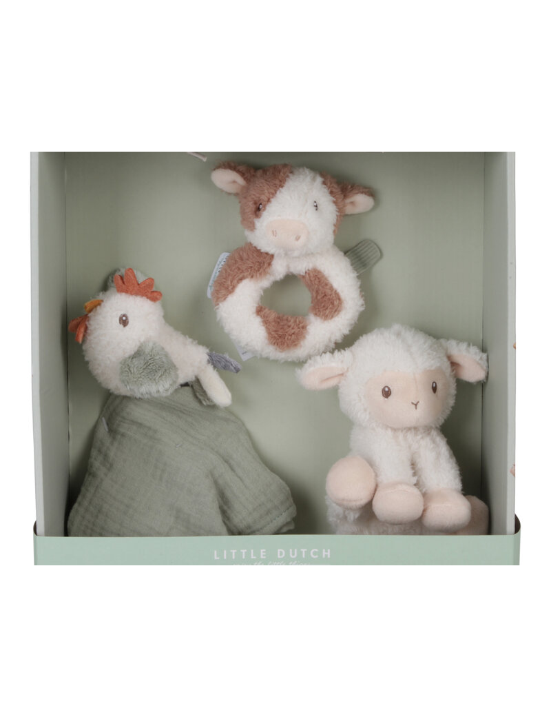 Ce coffret cadeau de la collection LITTLE FARM de la marque LITTLE DUTCH est le cadeau idéal à offrir pour une naissance ou une baby shower grâce à son coffret complet, avec le doudou tout doux avec une petite poule, le grelot en vache et encore la peluche mouton.