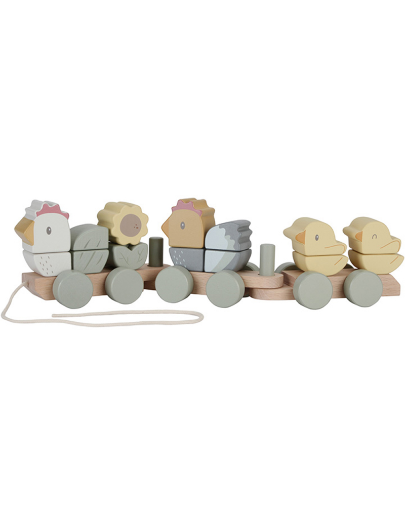Ce beau train en bois de la marque LITTLE DUCH sur le thème LITTLE FARM est illustré avec la poule et ses poussins.