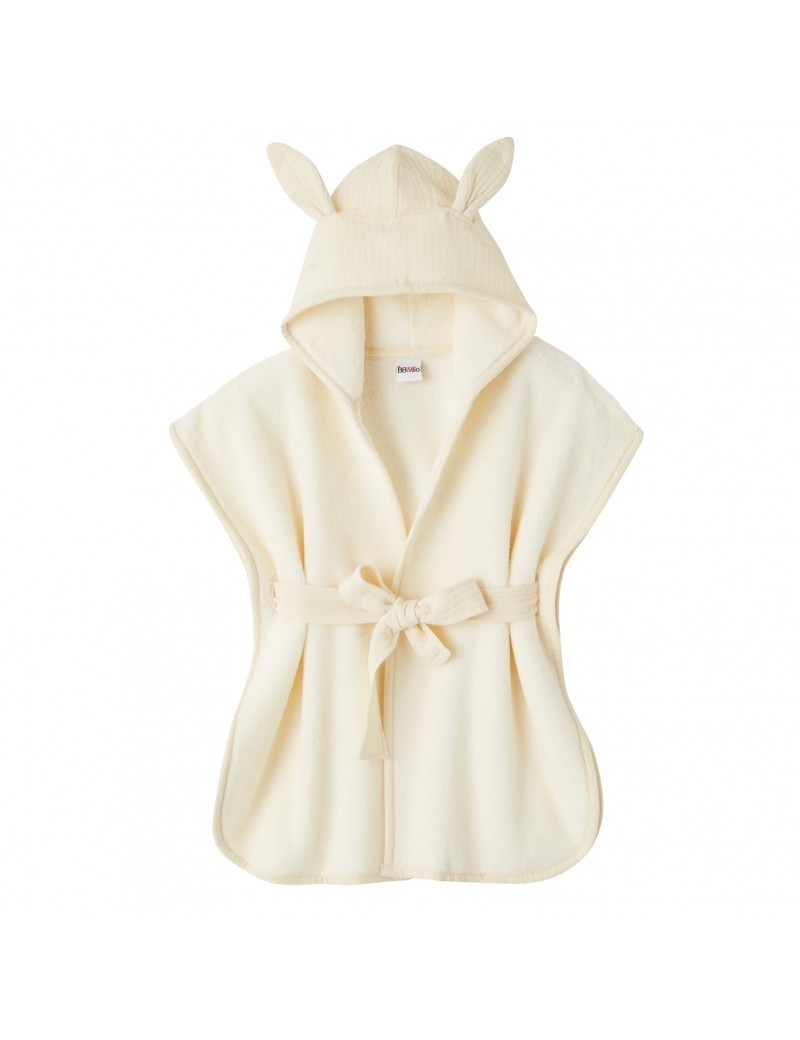 Un adorable peignoir en éponge bambou avec capuche et ceinture en double gaze de coton ton sur ton. Petites oreilles de lapin sur la capuche.