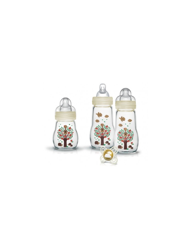 Ce coffet contient : 1 biberon en verre 170 ml avec tétine débit 1 (lent) 2 biberons en verre 260 ml avec tétine débit 2 (moyen) 1 sucette perfect naissance