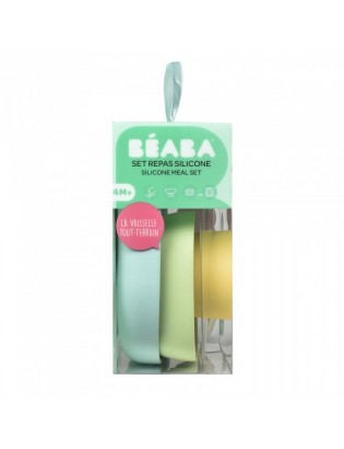 Coffret repas de chez BEABA en couleur jaune, composé d'un bol et d'une assiette ventouse, d'une cuillère et d'un verre.